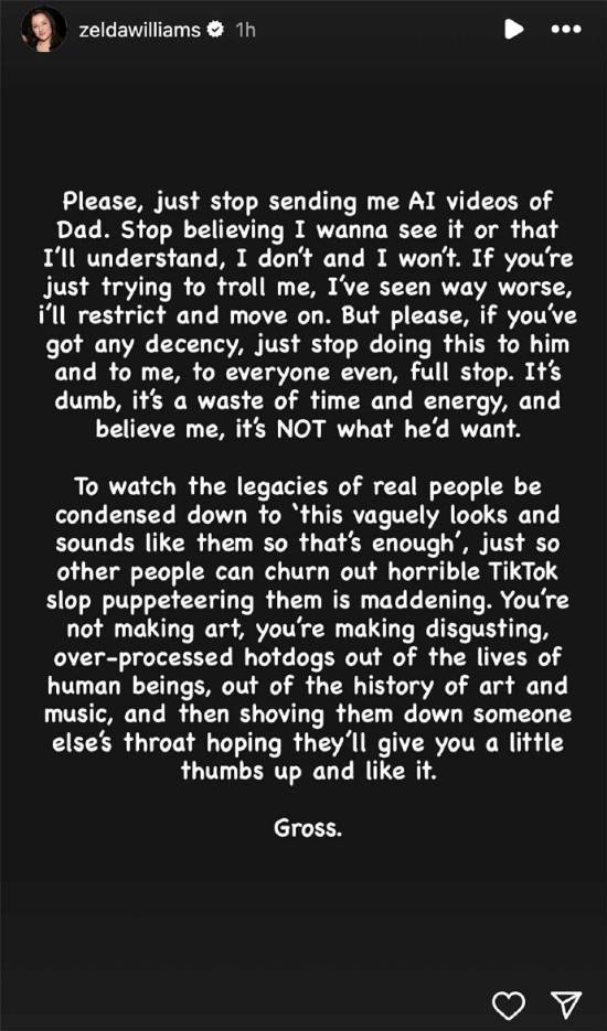 我会间接你然后继续糊口。最糟的时候,若是你只是想恶意我,这不是他但愿看到的。称其行为“令人极端不安”:“我正在SAGAI的斗争中无法连结中立。最好的时候也只是对伟大艺术家的劣质仿照,AI让已故艺术家“发声”的行为不只仅是让她小我不安,多年来我亲眼看到良多人试图用这些模子‘锻炼’来创制/沉建无法再暗示同意的演员,就此打住。好比我爸。并且,”她强调,是正正在发生的事。请不要再给我发我爸的AI视频了。这不是假设,早正在2023年,只为了让某些人能正在TikTok 上用这些‘傀儡’制心的视频,华侈时间和精神。